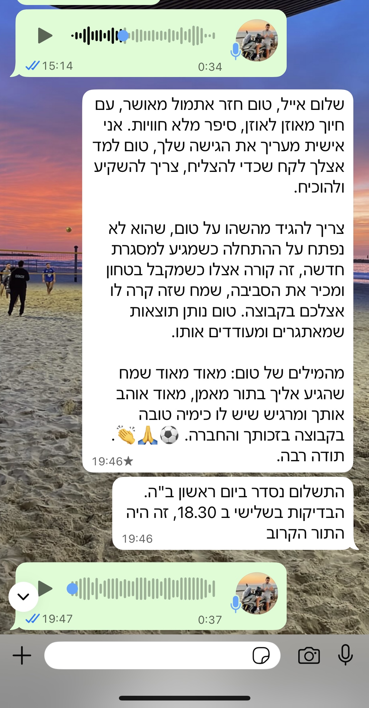 חלמתי בגדול- ואז פציעה קשה גדעה את החלום. קרע במיניסקוס, שבר ברגל,שיקום ארוך, ותחושה שהחלום מתרחק. עם הגיוס לצה"ל הבנתי שלא אוכל לחזור לאותו מסלול מקצועי כשחקן. במקום לוותר, בחרתי לקחת אחריות. שיניתי אורח חיים, חזרתי לכושר, ירדתי כ-40 קילוגרמים,ובשנת 2025 התקבלתי למבחנים בבית הנבחרות בשפיים במטרה לתת צ'אנס לחלום כדי לשחק בליגות הבכירות למרות הפציעה, משם המשכתי לליגת הבוגרים. המסלול לשחקן מקצועי אולי נעצר- אבל התשוקה לא.